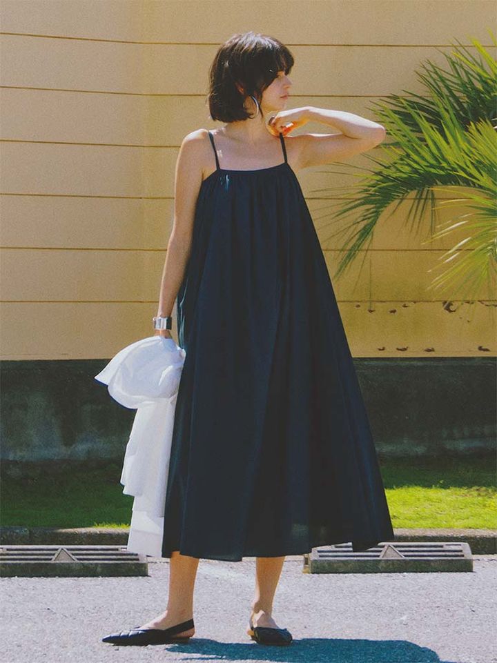 小細工なしでも着映えが図れる胸元から広がるボリュームフォルム。華奢なストラップとそこからのぞく素肌による女らしさが、装飾がなくともキレイに見える飾り気に。ドライタッチなコットン素材だから、黒でもカジュアルにアレンジが可能。体のラインを拾うことなく心地のいい見た目につながる適度なゆとりがあるから、肌見せもセンシュアルになりすぎない。