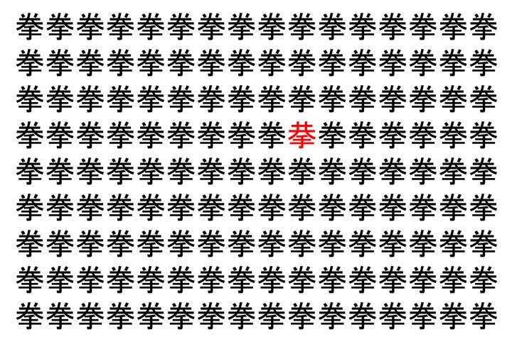 画像の中には、「拳」という漢字が縦に9行、横に16個並んでいます。 全部で144個となりますが・・・、そのうち1つは「異なる漢字」となってますよ!!