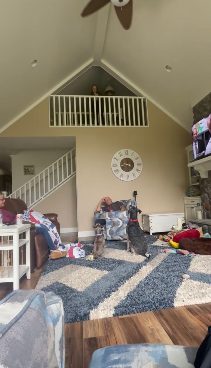 3. 2階を見上げるイヌたち。首を長くして待っていたものとは?!【アメリカ・動画】