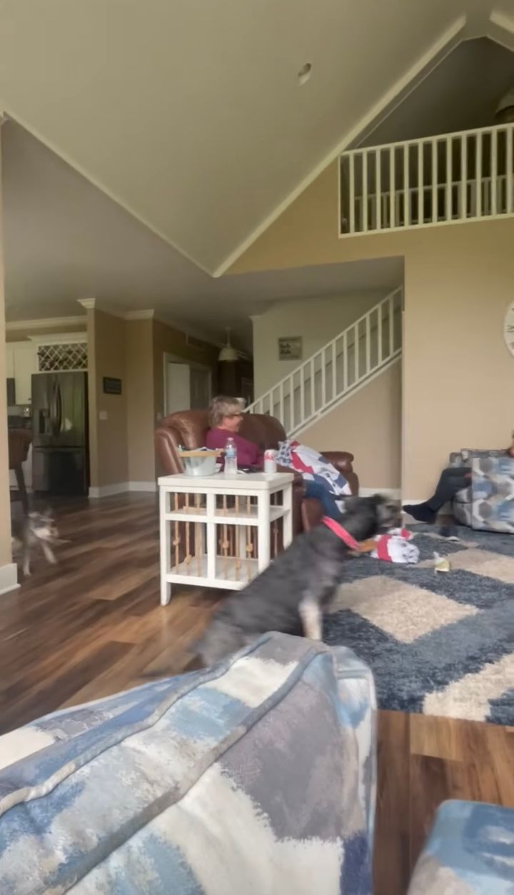 家の中を元気に駆け回る2頭のイヌ。 そのうち、右手にいる体の大きな子が撮影者さん夫妻の愛犬です。