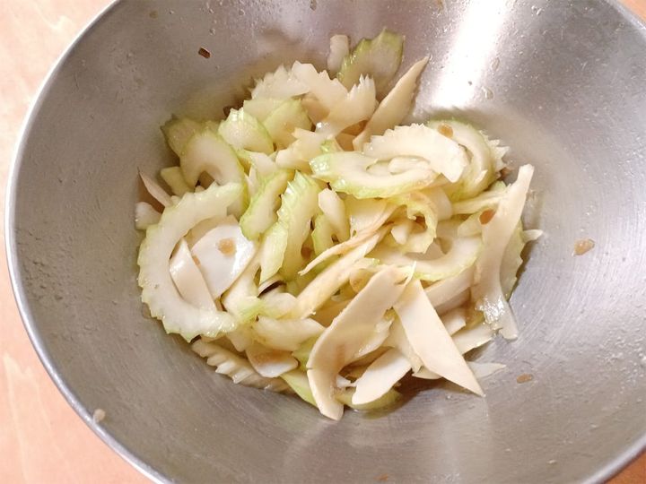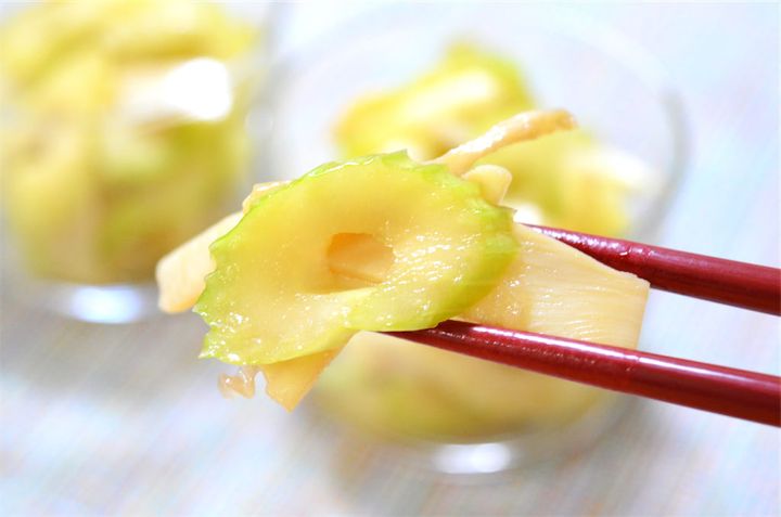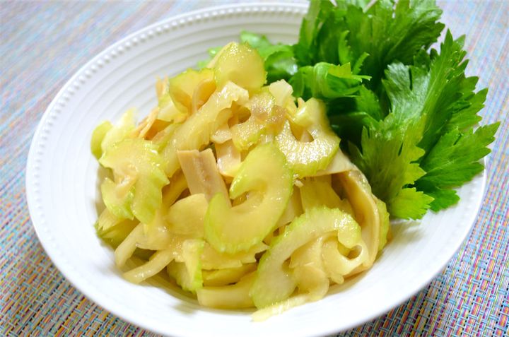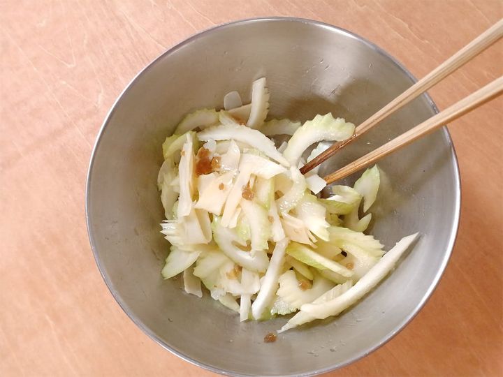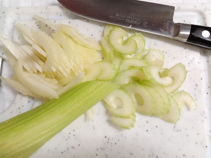 繊維を断ち切るように斜め薄切りに切ることで、味が染み染みになるそう。セロリの筋も気にならなくなりますよ。