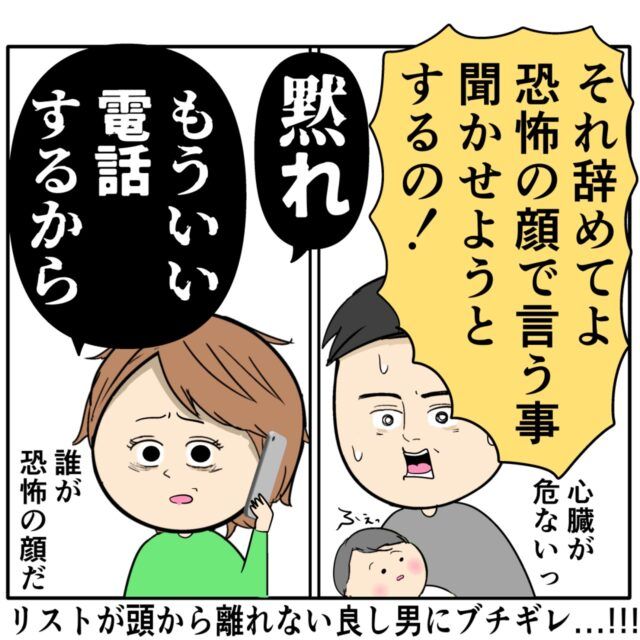「それやめてよ。恐怖の顔で言う事聞かせようとするの!」すみれさんのあまりの迫力に良し男さんは怯えます。そんな良し男さんを「黙れ」と一喝し、義母に電話をかけるすみれさん。やば美さんの迷惑行為を義母になんとかしてもらいたいすみれさんと、モラハラのことばかりを気にする良し男さんの想いはいつまで経っても交わることはないようです。