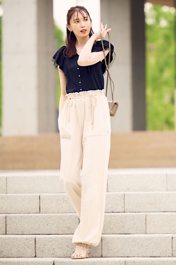 軽やかにはけるオフホワイトのスウェットパンツは、ウエストのドローコードを左右でリボンに結べる甘めルックス。ルーズに転ばないよう、トップスをコンパクトにしてシルエットにメリハリを。