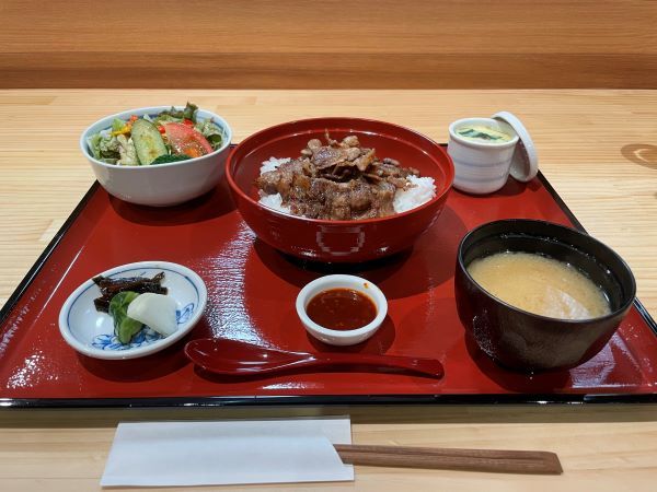 私はランチタイムに、焼肉定食(サラダ、茶わん蒸し、みそ汁、お漬物)1,100円を頂きました。お肉は炭火で焼いてあるので、香ばしい香りと脂身のジューシーな味が食欲をそそります。