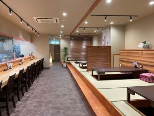 小倉北区の浅香通りと中津橋の間の通り沿いにあり、店内に入るとすぐに掛け軸やお香、炭など和テイストのディスプレイは落ち着いた雰囲気。広々とした店内は、6人掛けの堀こたつ式のテーブル席とカウンター席に分かれており、一人でも多人数でもゆったり座ってくつろいで食事ができます。
