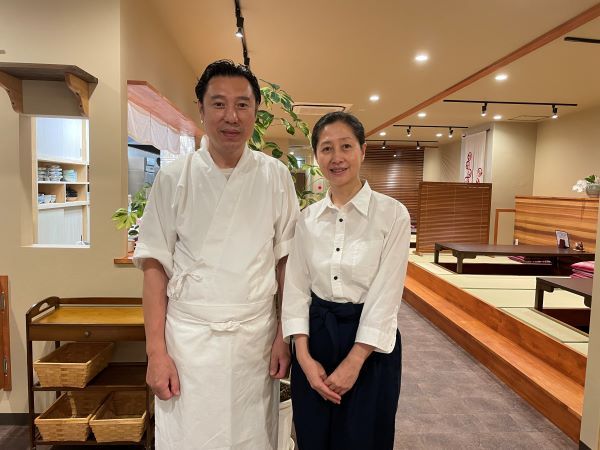笑顔が素敵な、オーナーで料理人の姜鵬(キョウホウ)さんと、奥様の許萍(キョヘイ)さん。小倉に出店したきっかけは、日本が好きで北九州に友人がいた事と、料理人の姜鵬(キョウホウ)さんは大連で17歳から4年間は中華料理、21歳から日本料理を習っていて、魚捌きと鰻の炭火焼きが得意なので、鰻と和食のお店に決めたそうです。