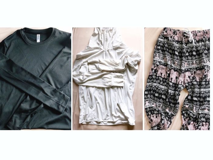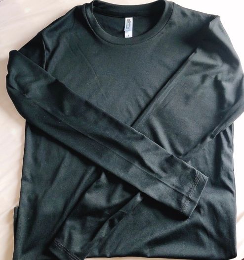 最近、Tシャツの代わりに着ているのは、ロンTタイプのラッシュガード。こちらは楽天で購入したもので、真っ黒でなんとも地味ですが…汚れもあまり気にならなくて普段着としてとても使えます。昔は、夏は綿素材のTシャツをよく着ていましたが、ここ数年がもう暑過ぎるせいか、汗染みなどが気になってしまっていました。酷暑の今は、こういった吸汗&速乾性のある素材のものでかつ長袖だと、前述のパーカのように暑さと紫外線、冷房冷え防止にもってこいです。どちらも、洗濯後すぐ乾くところもとっても助かりますね!