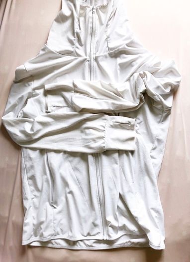 こちらはAmazonで購入しました。少しひんやり感もあり真夏に来て着ていても暑くないどころが涼しい! 長袖でサムホールもついているので、日傘からはみ出てしまう腕や手の甲の日焼けも防げます。軽くて薄いので小さく折りたたむことができるのも便利。帽子もついているので、かぶってファスナーをあげると顔の下半分も隠せますし、首の後ろの日焼けも防げます。