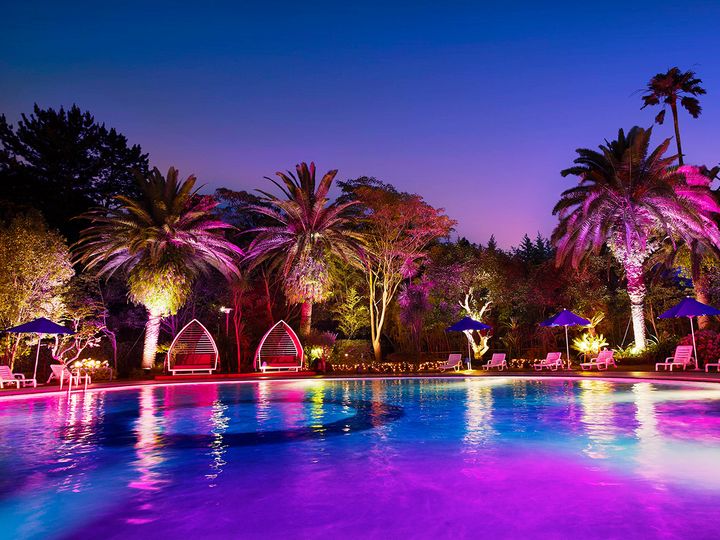 日が暮れる頃には、プールサイドや水中がライトアップされて艶やかな空間に。
