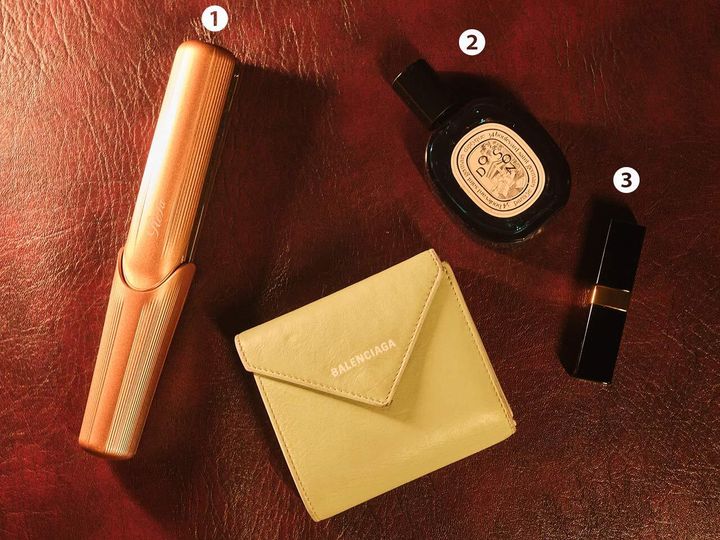 「リファ」のフィンガーアイロン(❶)はコンパクトで持ち運びに便利。香水はディプティックの「ドソン」(➋)。