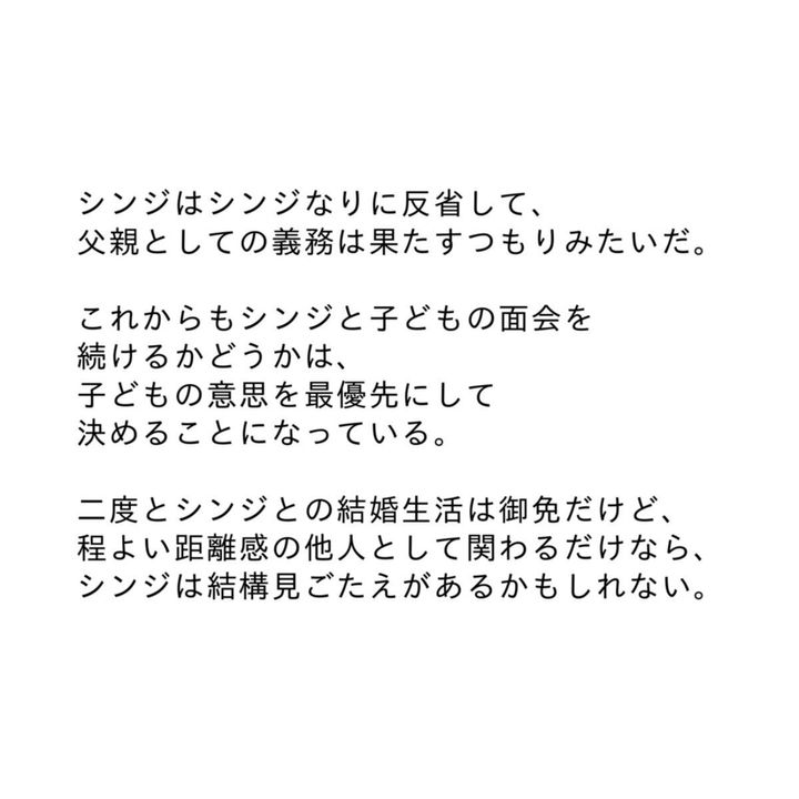 離婚届を突きつけるシンジの経緯が、シンジ目線で描かれていますね。子どもができたのだから、お互い変わること我慢することができることは当然ではないでしょうか。もし、自分のパートナーがシンジと同じような考えだとしたら、皆さんはどうしますか?