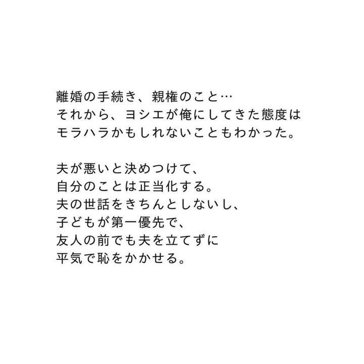 自分がしてきたことが、モラハラだったと思いもしなかったシンジ。皆さんはこの男の末路をどう思いますか?なぜ、妻のヨシエさんは子育てを大変だと感じていたのか、もっと配慮するべきことはなかったのか、そういったことを考えることができたら、結末は変わったかもしれません。