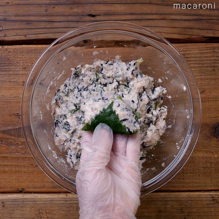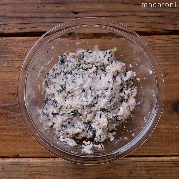 2: ボウルに鶏ひき肉、豆腐、ひじき、長ねぎ、大葉、しょうが、塩こしょう、片栗粉を入れてよく混ぜ合わせます。
