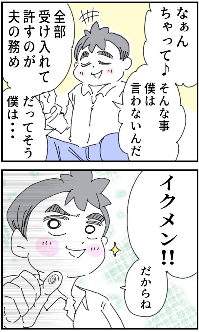 すると「なぁんちゃって!そんな事僕は言わないんだ。全部受け入れて許すのが夫の務め!」そう言った後で「だってそう!僕は・・イクメン!!だからね!」と誰も見てもいないのに決めポーズを取るいちろうさん。