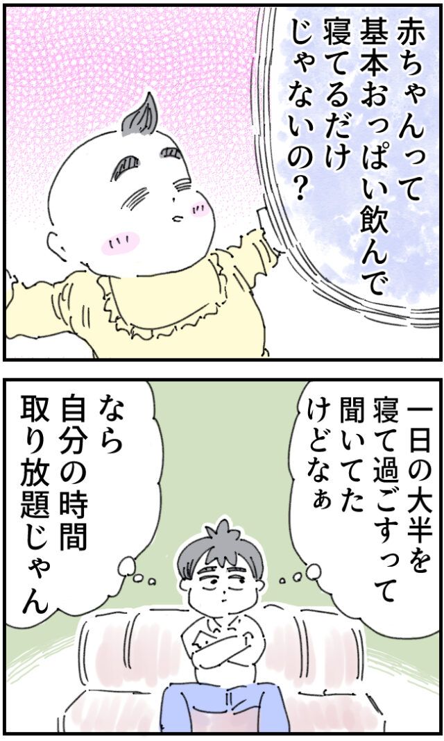 かおりさんがシャワーを浴びている間、すやすやと眠るこはるちゃんの寝顔を見つめていたいちろうさん、ふと心の中に「育児ってホントにそんな大変なのかなぁ・・?」という思いが芽生えてきました。「赤ちゃんって基本おっぱい飲んで寝てるだけじゃないの?」さらに「一日の大半を寝て過ごすって聞いてたけどなぁ。なら自分の時間取り放題じゃん」とこれまで見聞きした育児の情報を頭の中で思い浮かべます。