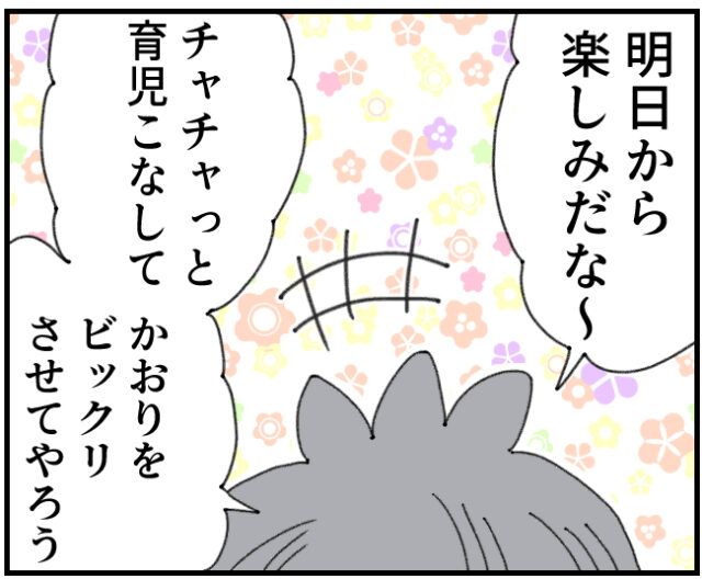 気分も新たに「明日から楽しみだな~。チャチャッと育児をこなして、かおりをビックリさせてやろう!」明日からの育児に向けていちろうさんはテンション高く気合いを入れました。