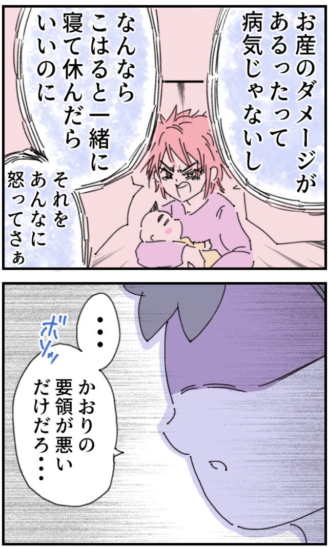 さらに「お産のダメージがあるったって病気じゃないし、なんならこはると一緒に寝て休んだらいいのに。それをあんなに怒ってさぁ」いちろうさんが考えれば考えるほど、憤ったかおりさんに納得がいかなくなってきてしまい「・・かおりの要領が悪いだけだろ・・」心の中に生まれた思いが口をついて出てきました。