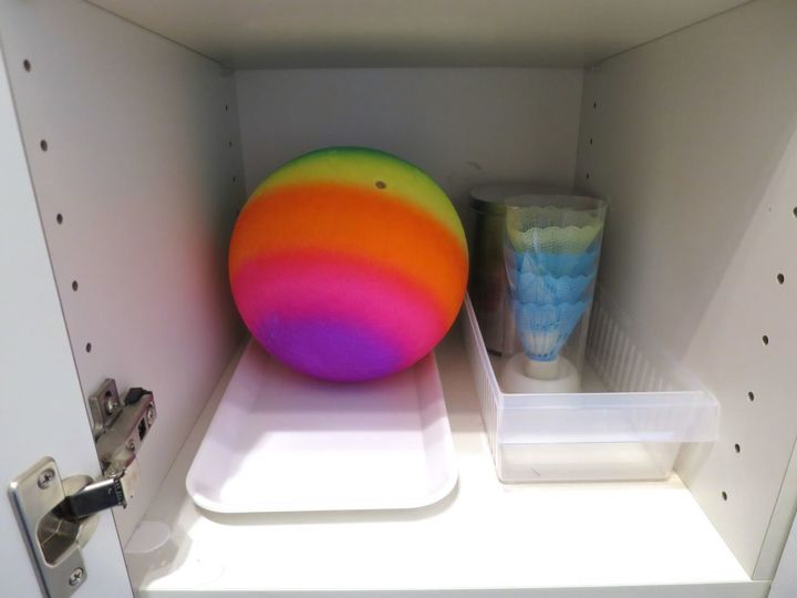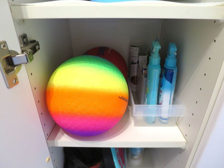 ボールを棚の中に置いて収納したい場合は、転がりでてこないように少し工夫が必要です。例えば、ボールの下にトレーを敷く方法がその1つ。トレーのフチが引っかかるので、ボールが前に転がりでてきません。また、外から持ち帰ったボールを直接置いても棚板を汚さずに済むという利点も。