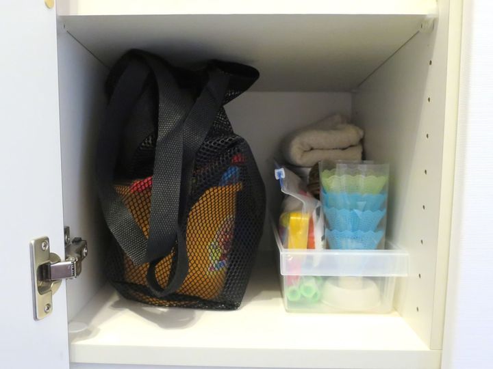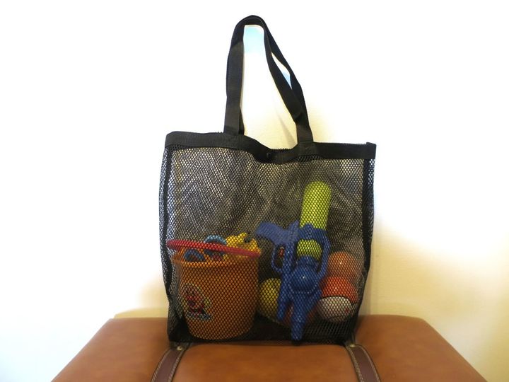 砂遊びや水遊びの道具は、それぞれをメッシュバッグなどにまとめておくと便利です。サッと持ち出しやすく、遊び終わった後は洗ってそのまま外に干すこともできます。