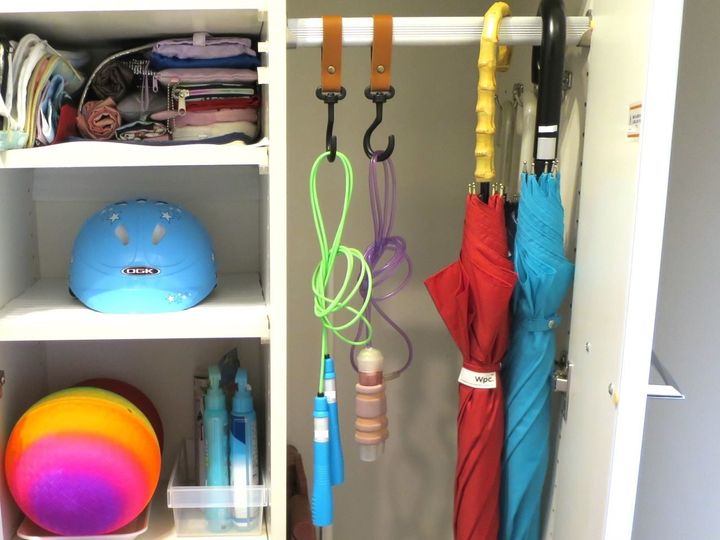 外遊び道具の中には、引っかけ収納が便利なものもあります。例えばなわとびは、1本ずつフックにかけておくと取り出しやすく片付けやすいです。