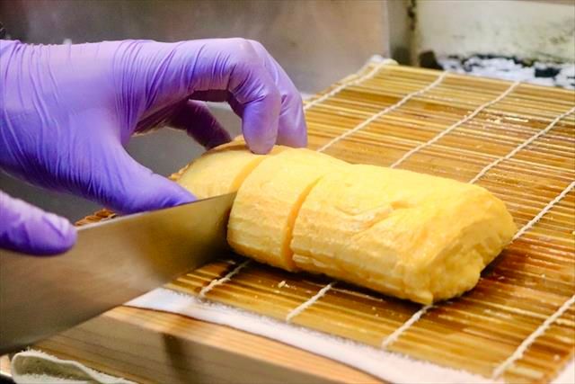 卵液を足しては巻く手順を素早く繰り返し、最後は巻きすで形を整え、なんと3分ほどで完成! スピードはもちろんのこと、この火の強さなのに少しの焦げもなく、まさに職人技でした。
