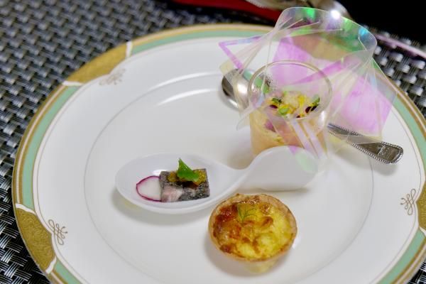 ・人参のムース・クスクス添え…柑橘のジュレ ・魚介のキッシュ…カルダモン風味 ・豚肉のテリーヌ・竹炭風味…自家製ママレード添え