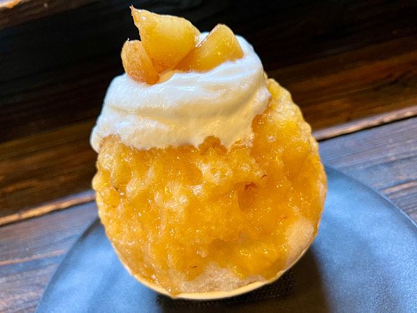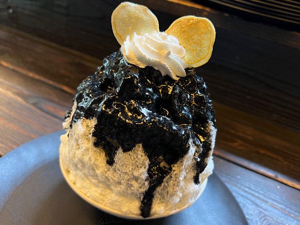 真っ黒でツヤツヤな色味の黒胡麻ソースにコンデンスミルクが混ざり、濃い胡麻の味わいが珍しい一品。1番上にはお芋のチップス、中には胡桃が隠されていて、ふわふわの氷とカリカリな食感が組み合わさり、食べていて楽しいかき氷でした。