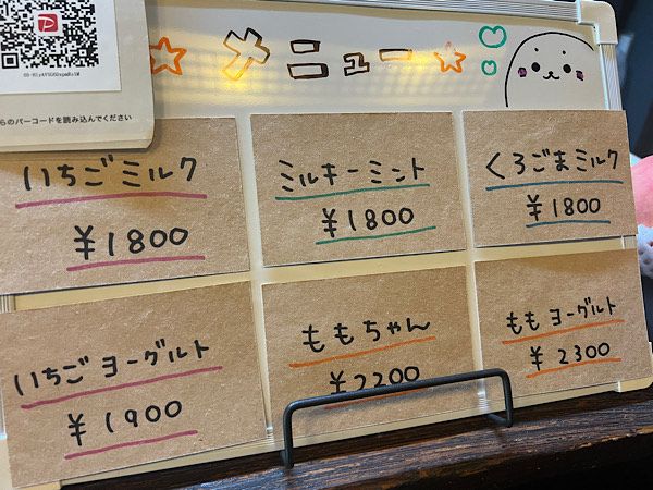 この日のメニューは定番のいちごミルクや桃のほか、ミルキーミントに黒胡麻ミルクといった変わり種も6種類ありました。中でも前々から気になっていた『黒胡麻ミルク(1800円)』と『ももヨーグルト(2300円)』を注文しました。料金は席での前払い制で、現金とPayPayを利用できます。