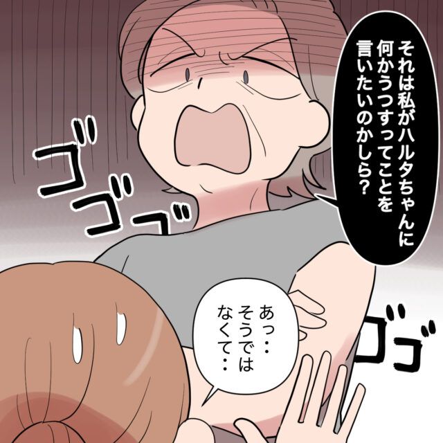 義母が仕切るお食い初めの席で「母さんの箸を使って欲しくない!」とゆうさんに言われた義母は「今は箸や食器の共有では虫歯はうつらないと言われている」とドヤ顔。そして「私が汚いってこと!?」と憤慨!「私は汚くないし祖母なんですよ。大丈夫よ、ハルタちゃん」とハルタちゃんに話す隣で「あっ・・でもうつるのは虫歯以外にも・・」とマキさんが伝えようとすると被せ気味に「は!?」とイラついて言われてしまいました。