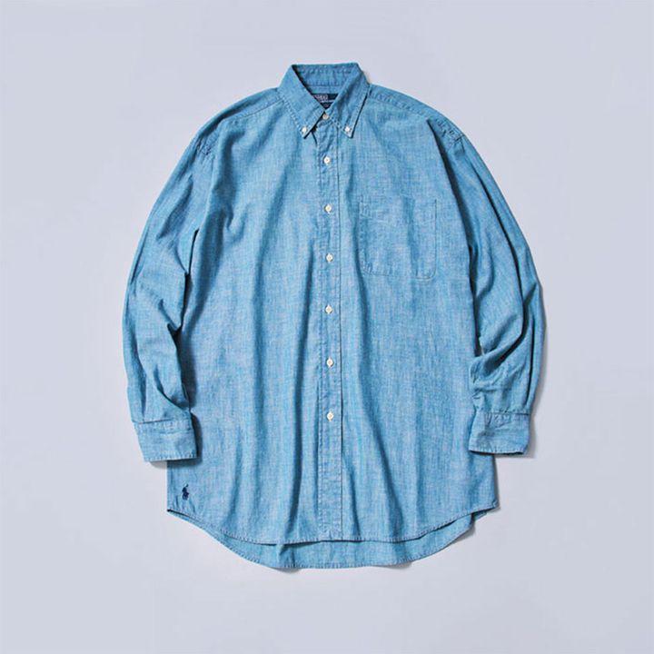 暑い日もサラッと羽織れる柔らかいシャンブレーのシャツは、メンズのビッグフィットのSサイズ。ラフな雰囲気ですが、衿のボタンダウンできちんと感もあり。おなじみポニー刺繍は右裾にさりげなく。