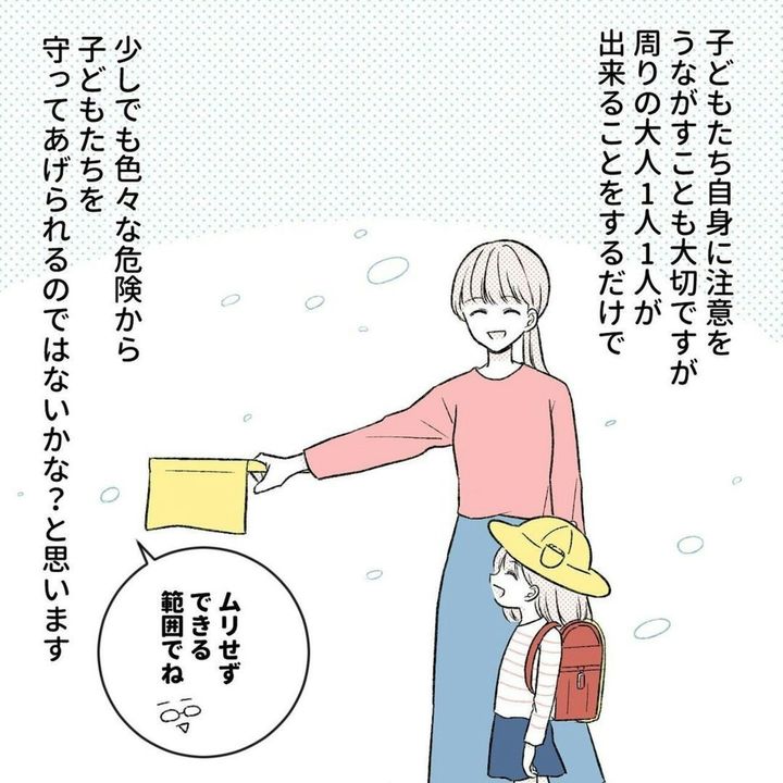 不審者はいつどこにいるかわかりません。だからこそ、誰でも被害にあう可能性があります。学校や家で子どもに注意喚起することはもちろん、日ごろから周りの大人が可能な範囲で子どもの安全を見守る必要があると感じる作品です。