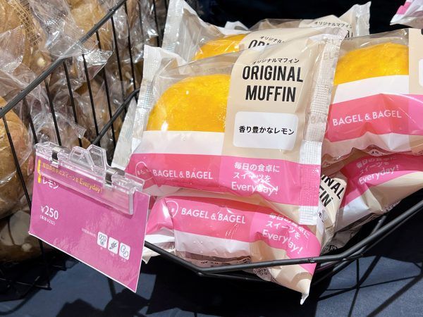 15種類のベーグル(220円)と、8種類のマフィン(250円)がずらりと並んでいます。 ※税込み価格です。