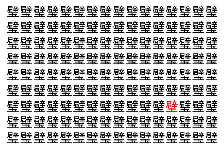 画像の中には、「璧」という漢字が縦に9行、横に16個並んでいます。 全部で144個となりますが・・・、そのうち1つは「異なる漢字」となってますよ!!