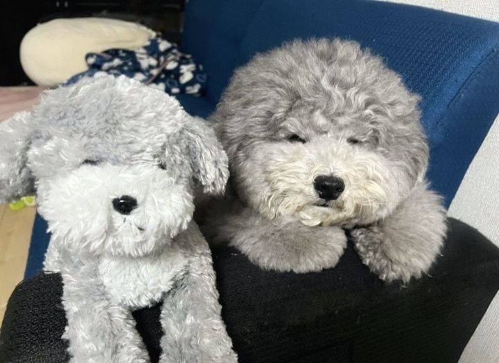 この投稿に「ほんと見分けが難しい」「犬が寄せて行ってる」というコメントがついていました。ここまでまねできるとは、飼い主さんも想像していなかったはず。パッと見ただけではどちらもぬいぐるみに見えてしまうほどですよね。