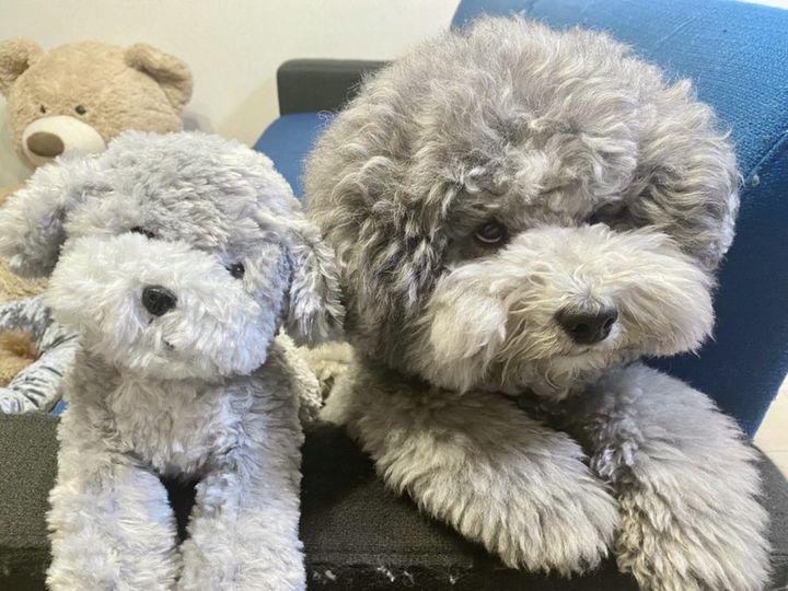 ふわふわとしたグレーの毛が特徴的な犬・れあるくん。飼い主さんがれあるくんに似ているぬいぐるみを買ってきたそうなのですが、半年後の2匹にはある変化が…。