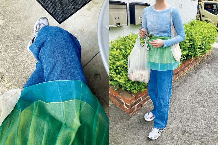 「紫外線対策でシンプルな薄手のロンTにデニムを着ることが多い夏も、ただTシャツ×デニムだとマンネリ化してしまうので、去年から巻きスカートにハマっています。 薄手のシアー 素材なのでレイヤードしても暑くなく、無理なくおしゃれを楽しめます♡」