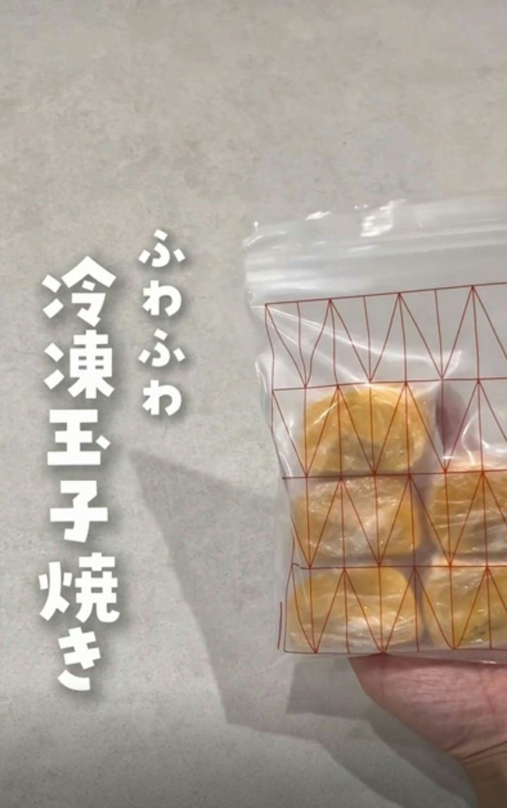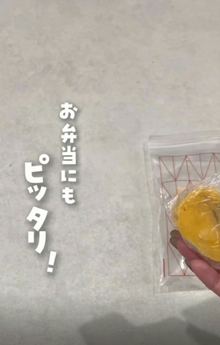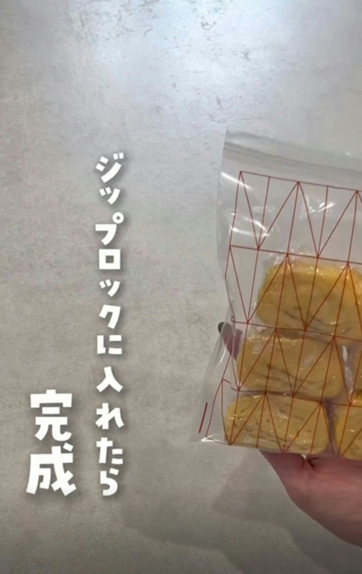 ラップで包めたら、ファスナー付きの冷凍用保存袋に入れます。しーばママ|ライフハックに沼った主婦さんによると、マヨネーズの油分と片栗粉の保水力により、冷凍してもパサつかず、解凍すればふわふわな玉子焼きにしあがるとのこと。