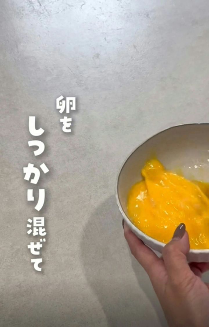 ボウルに、タマゴを3個割り入れてよく混ぜます。