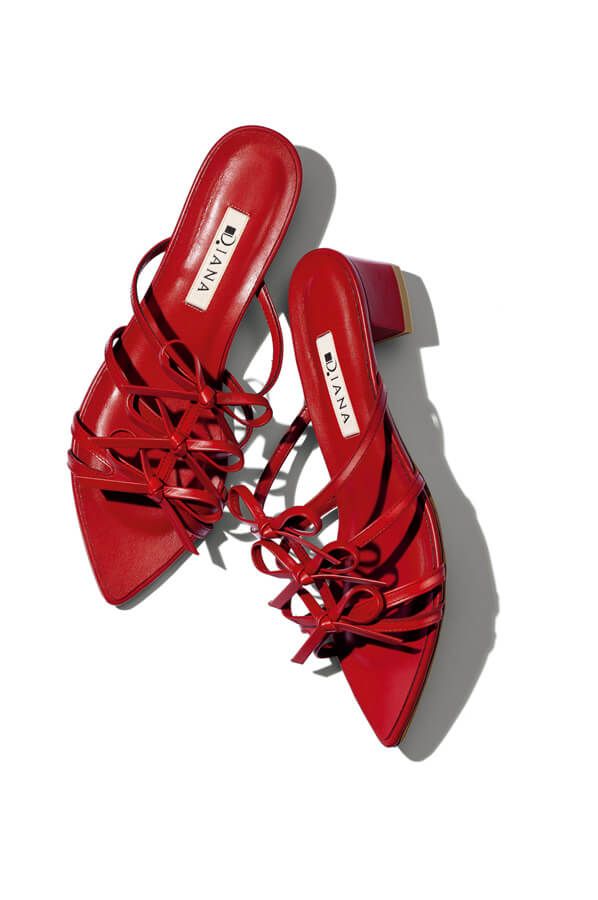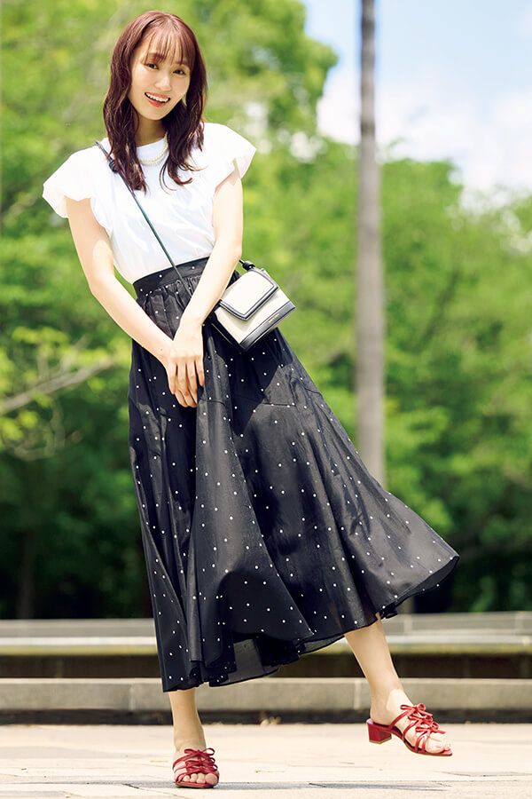 パフ袖Tシャツ×ドット柄スカートという軽やかなモノトーンルックには、赤小物を差してクラシカルな味つけを。華奢な3連リボンが目を引くポインテッドサンダルは甘さも可愛げも絶妙!