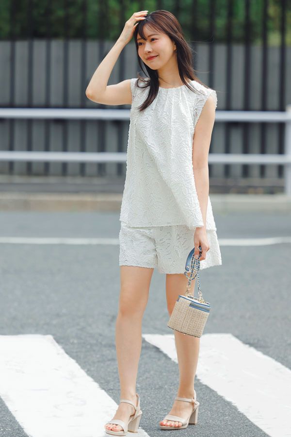 ゴージャスなフラワーのカットジャカードに肌見せで抜け感を添えて。ロマンティックムードな白ジャカードのセットアップも、ヘルシーなノースリ×ショーパンなら、デイリーシーンで気軽に取り入れ可能。小物もトーンをそろえて。
