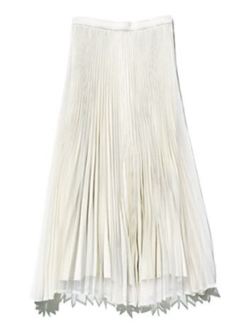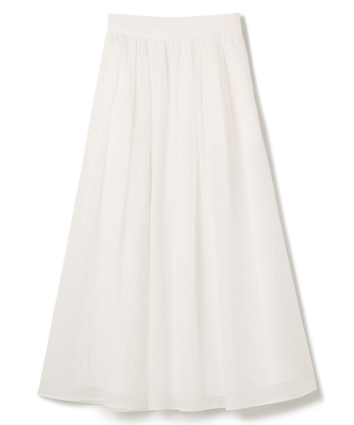 透明感のあるオーガンジーのプリーツが繊細な動きを拾う。長め丈のまま抜けもそこなわないよう、すそに高低差をつけた画期的なシルエット。 白プリーツスカート/TSURU By MARIKO OIKAWA