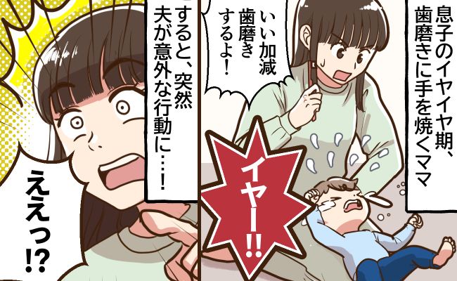 息子のイヤイヤ期で特に私が困っていたのが歯みがきタイム。逃げ回って泣きわめく息子に疲弊していた私ですが、そんな私と息子を見かねた夫が突然意外な行動に出たのです! 私には思いつかなかった斜め上の発想に、とにかく驚いてしまいました。