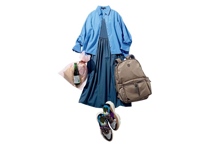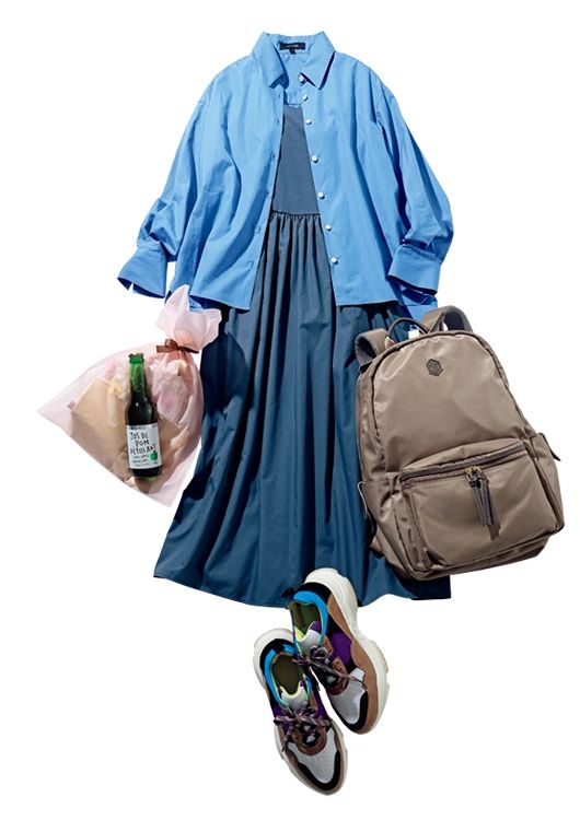 ボウタイ付きシャツ¥22,000/アンタイトル カップ付きキャミワンピース¥3,990/UNIQLO リュックサック¥15,950/ペルケ(アンビリオン) マルチカラースニーカー¥19,800/MANA