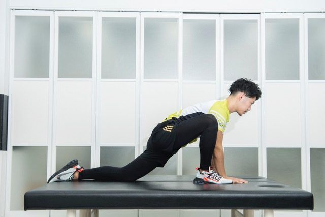 (1)片脚を前に大きく踏み込み、後ろに残した脚のひざと両手を床に着く