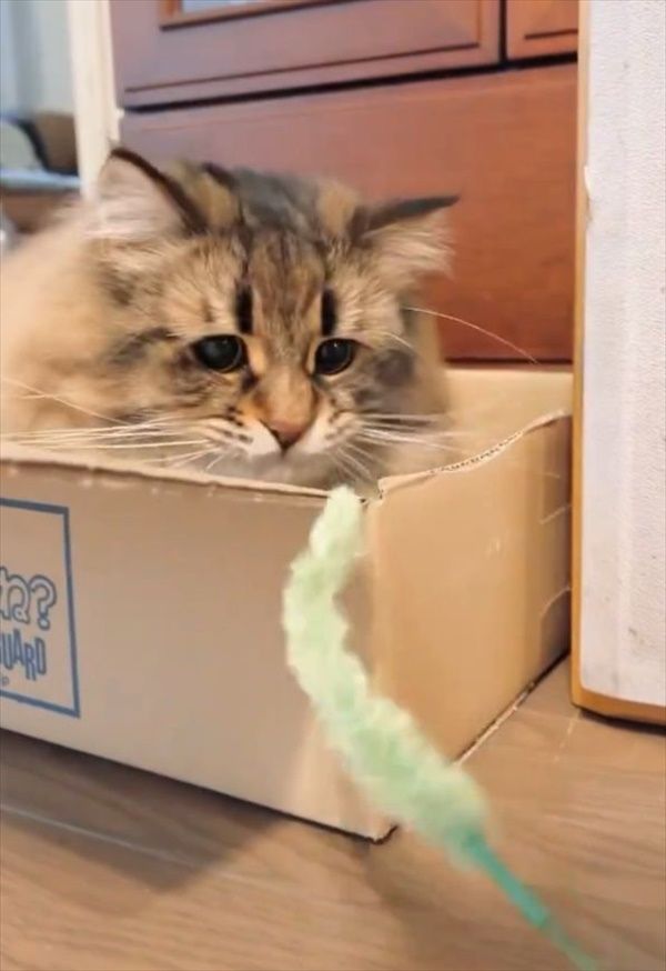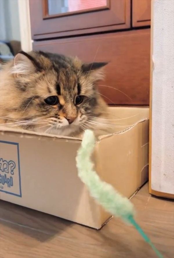 一旦、ダンボール箱におさまり、ねこじゃらしの動きを見つめていましたが・・・