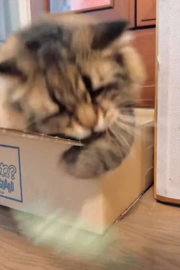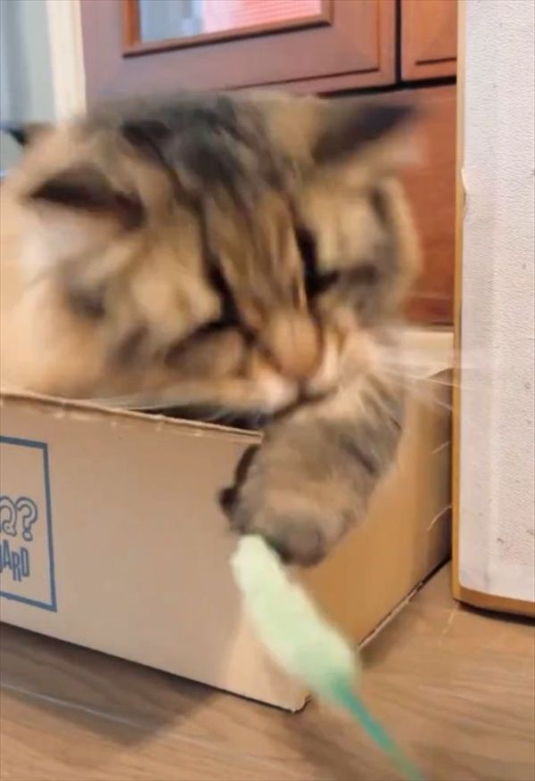再び猫パンチを繰り出します! ダンボール箱に戻っては猫パンチを繰り返すその様子。 小刻みな動きは、まるで「蝶のように舞い、蜂のように刺す」ボクサーのようですね。