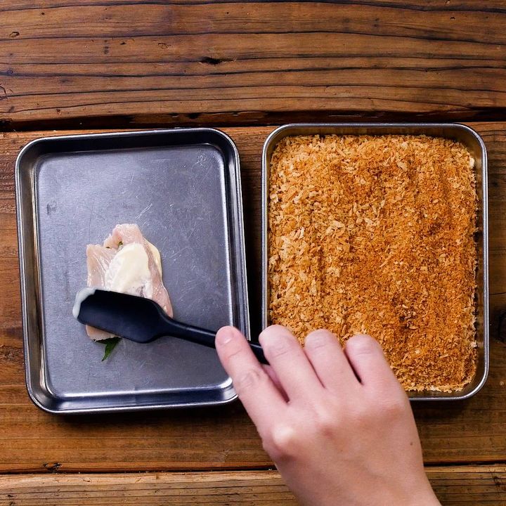 5: 鶏肉にマヨネーズを塗り、パン粉をまぶしてアルミホイルを敷いた天板に並べます。