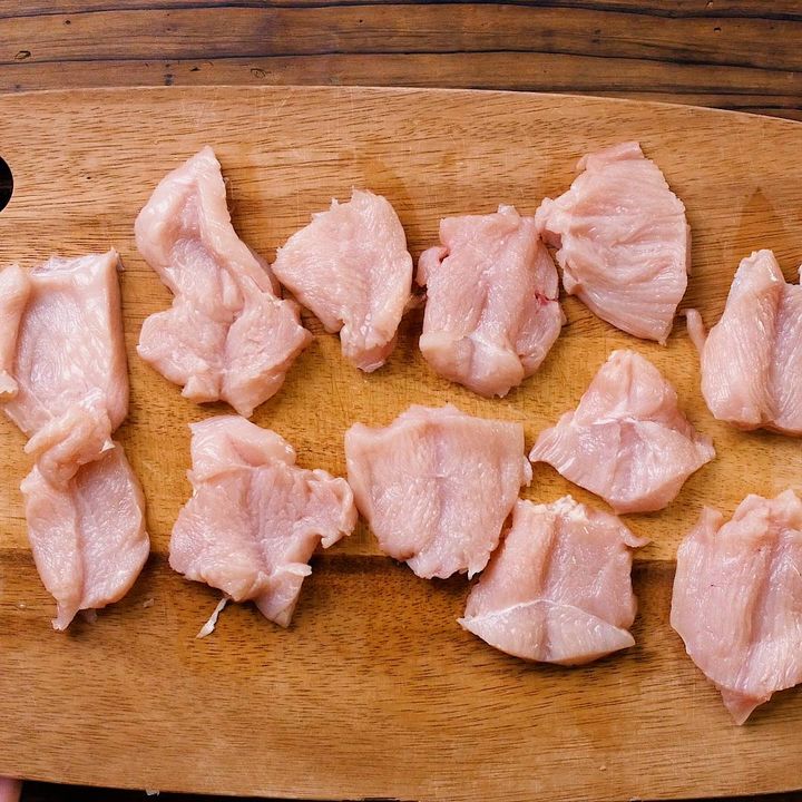 1: 鶏むね肉に切り込みを入れてから2cm幅に切ります。