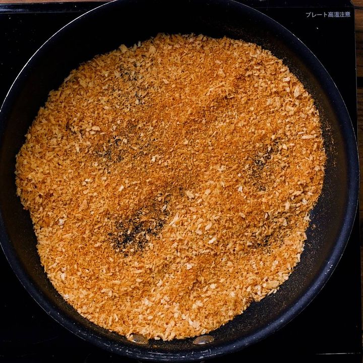 4: フライパンにパン粉をいれて中火で炒ります。色づいたら取り出します。