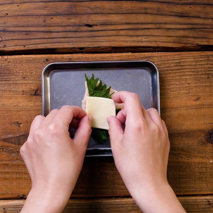 3: 味付塩こしょうをふって、大葉、チーズをのせて挟みます。